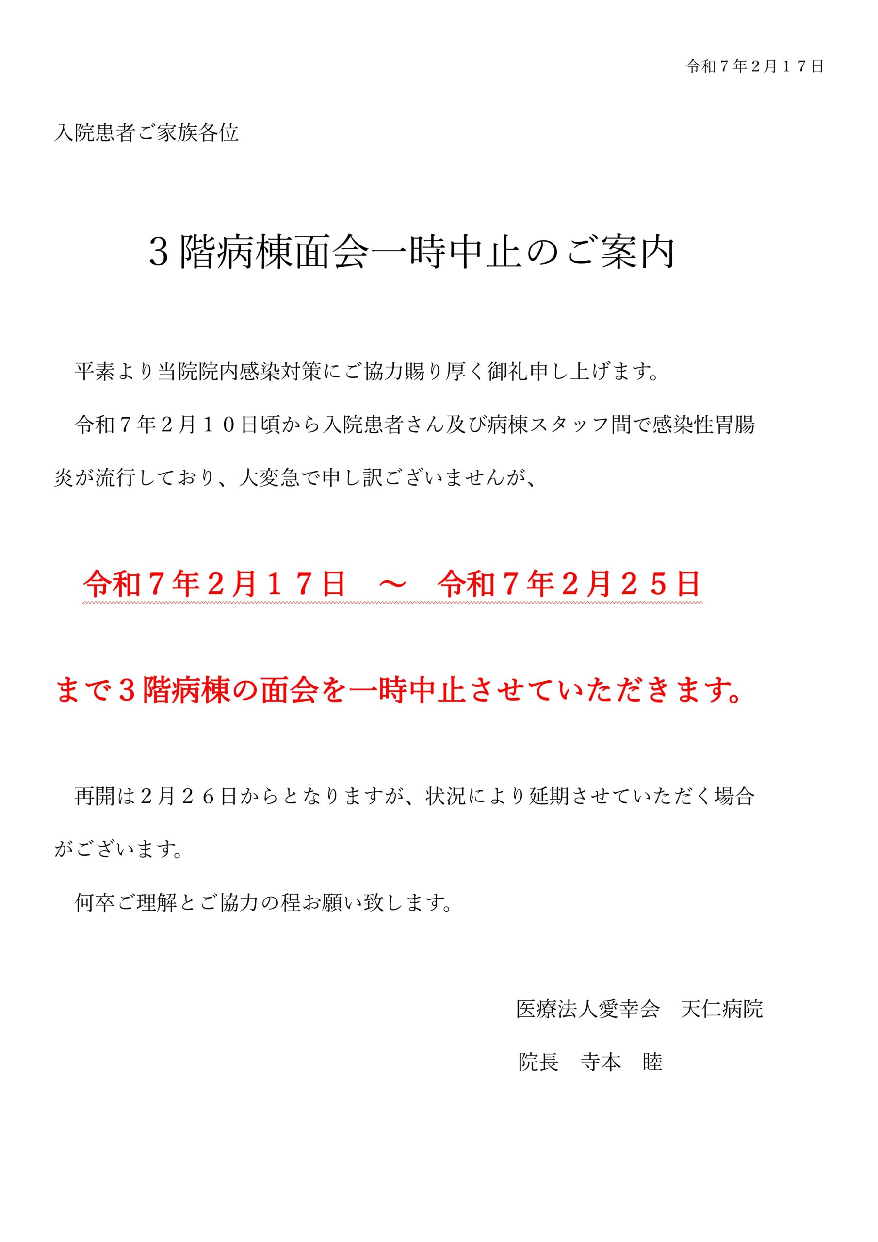 面会についてのご案内 現在、当院の面会制限は以下の通りです。 【面会】 月曜日~金曜日(祝日を除く) 14:00~16:30 ※予約不要 土曜日、日曜日、祝日 14:00~16:00 ※要予約(予約に上 […]