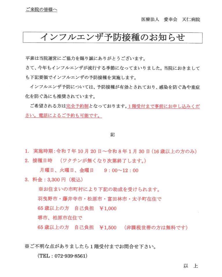 2025年10月1日より、インフルエンザ予防接種の受付を開始いたしました。