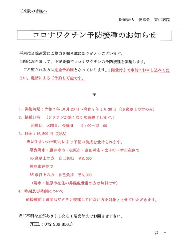 2025年10月1日より、コロナワクチン予防接種の受付を開始いたしました。