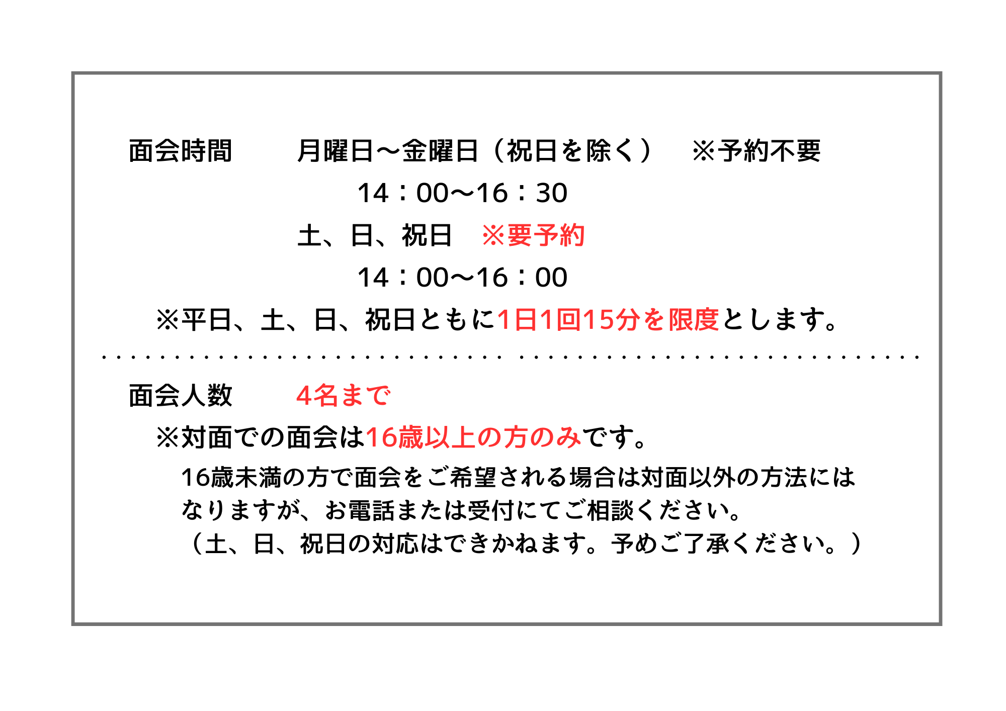 - 面会日の3日前から当日までに熱や風邪症状が認められた方の面会は、ご遠慮いただきますようお願いいたします。
